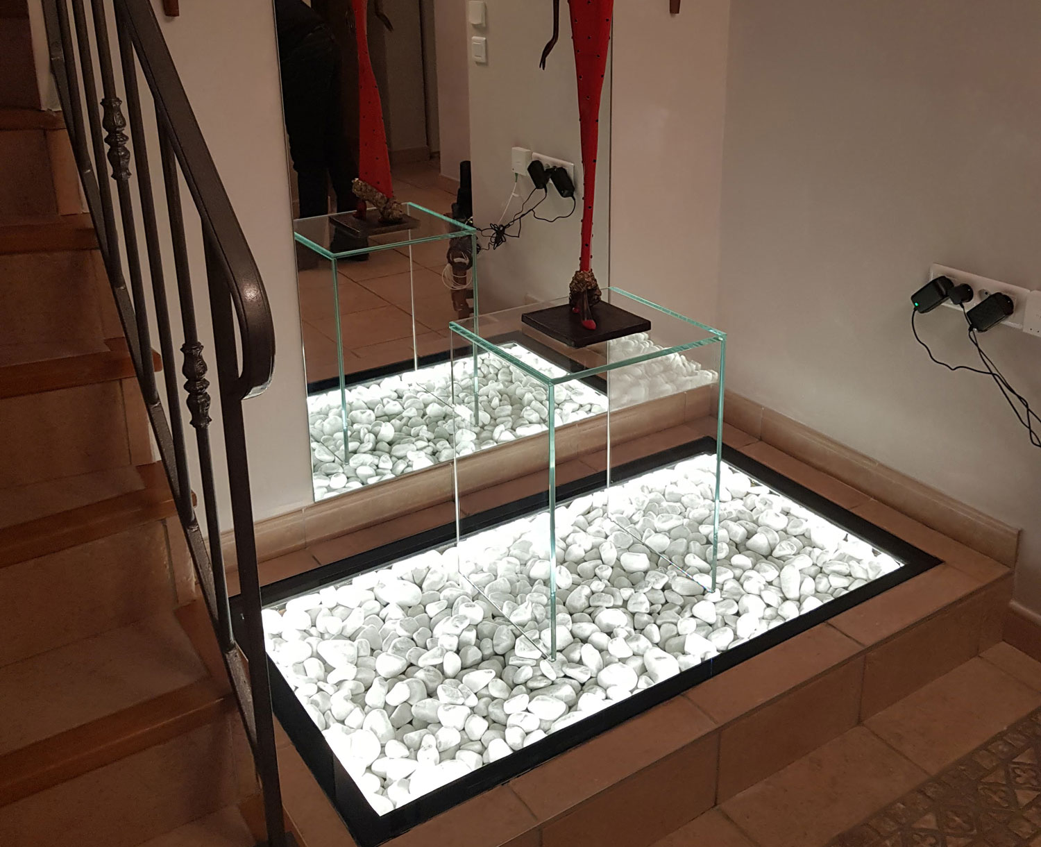 Le dispositif se compose d’un plancher en verre ainsi que d’une dalle de sol également constituée de ce matériau. Il inclut par ailleurs une insertion de lumière de type LED.